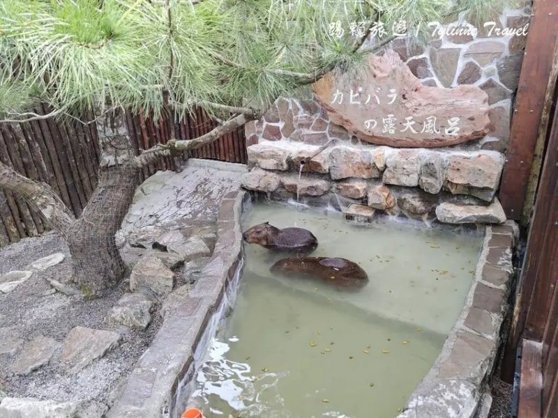 走到第二區還有一個「露天風呂」,是讓小動物泡溫泉的地方,下圖有一張是兩隻水豚泡在裡面看起來十分享受