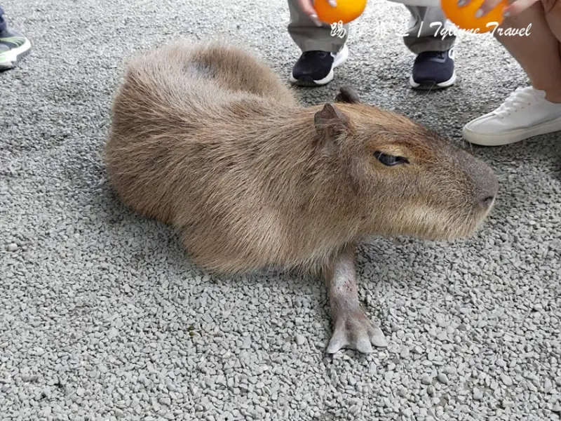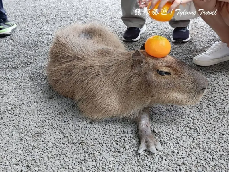 旁邊都有空心的橘子玩具可以使用,大部分的水豚脾氣都滿好的,可以偷偷把橘子玩具疊在他們頭上,就像網路上常常看到的畫面,我們最多還疊到三顆,疊完記得請他們吃一根牧草當作獎勵喔~
