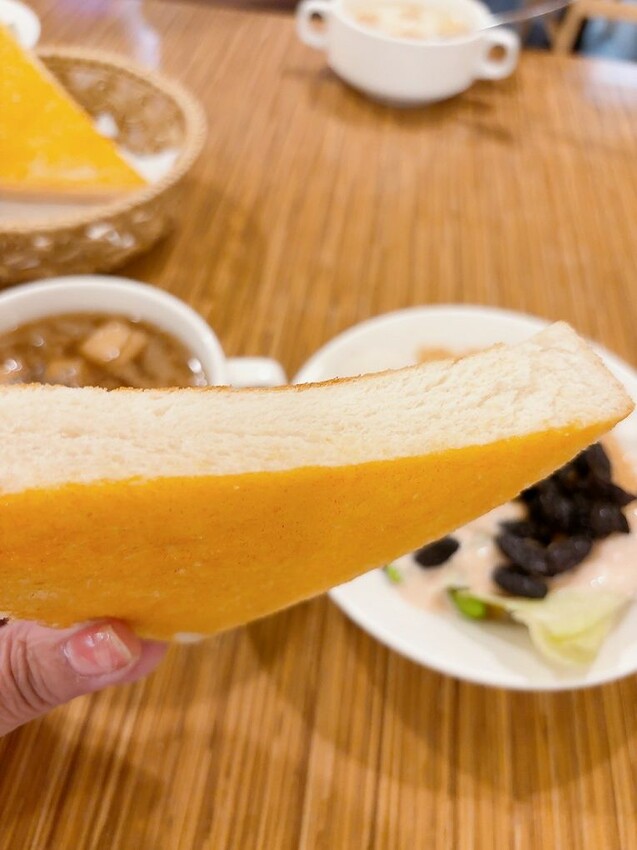 套餐有附奶油厚片吐司,吐司烤得外面酥酥脆脆的,裡面還是軟軟的,奶油香香甜甜的很濃郁,簡直是超級好吃,會默默吃光一片耶。