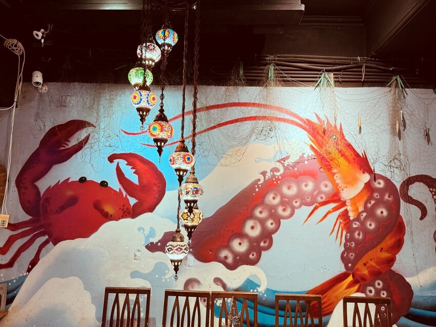 走進店內會先被吸引到整面牆的壁畫,沒想到竟然出於老闆親手創作的一幅壁畫,名為「深海浪漫」,尤其巨大的龍蝦躍出海面,彷彿要將整片海洋的鮮美都帶到你的餐桌上。