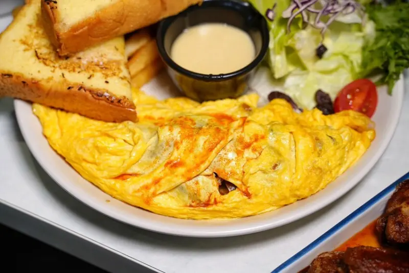 「墨西哥歐姆蛋」光是歐姆蛋就有一半盤子那麼大,一旁還塞滿了法吐、生菜沙拉及薯條,整盤超級豐盛,吃完超級飽!歐姆蛋切開,裡頭還藏著起司、美國香腸丁以及墨西哥辣椒,鹹香帶辣~整個開胃又涮嘴!拜託一定要點厚片法式吐司,鬆軟又香甜,還帶有淡淡的肉桂香氣,真的很頂!沙拉葉用的比很多店還好,還附蜂蜜芥末醬。
