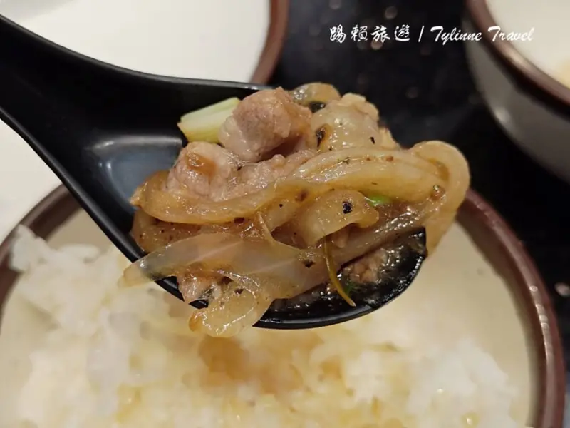 第一道是「黑胡椒牛肉」,調味料的口味比以往吃的還要重一點,但如果喜歡重口味邊吃邊扒飯的人來說會滿喜歡的