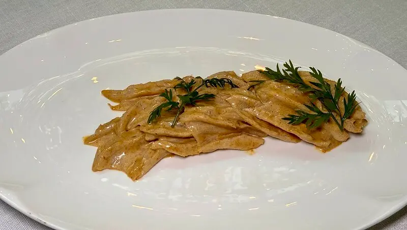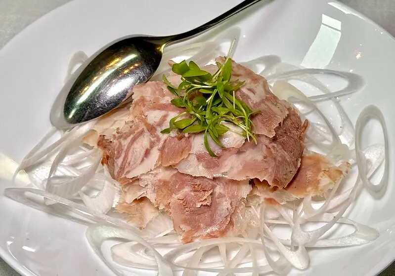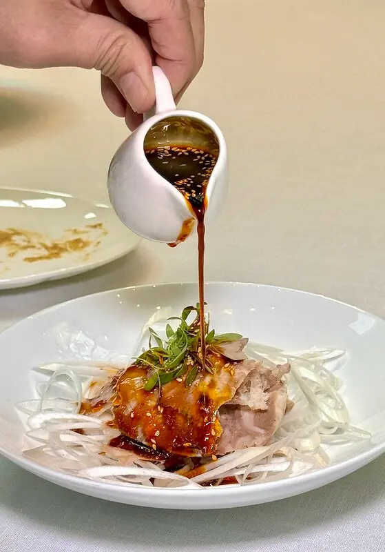 油甜爽脆的豬頸肉淋上帶點微辣的芝麻醬汁,搭著大量的蔥汁可當前菜又可當主菜,一小碟就能配上一壺白酒。
