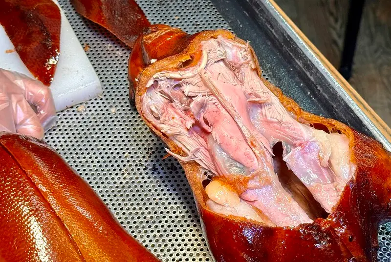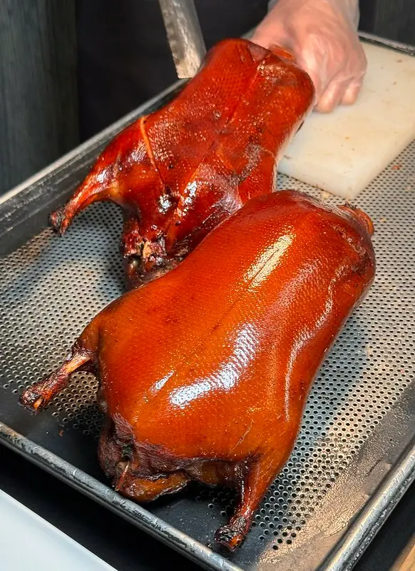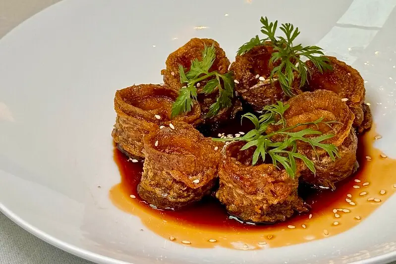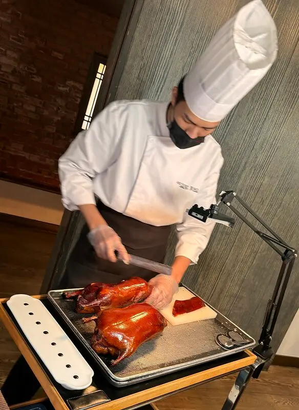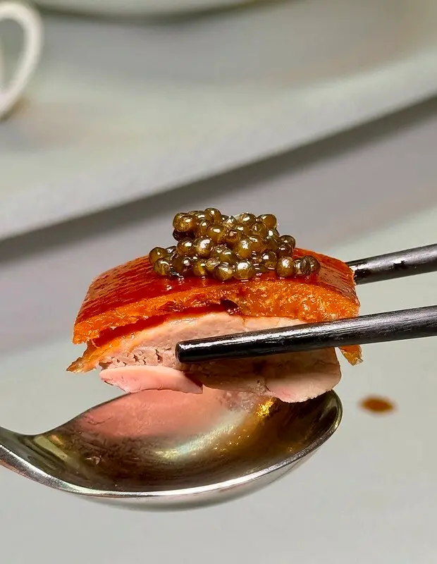 鴨肉配魚子醬薄片,這吃法已然是中國高端烤鴨的標配吃法。先說這烤鴨,跟我之前想像的完全不同,但的口感是油酥,而不是台灣片皮鴨強調的酥脆,甚至一點脆的口感都沒有,入口那是連著底下一層薄薄的油、肉一起化在嘴裡,香氣有一點像豬油渣,又多了烤過的香氣,認真說和我以前在中國各地吃到的烤鴨截然不同,個人非常非常非常喜歡,不管是口感還是香氣,至於要不要加魚子醬,個人還是覺得可有可無..但也不得不說加了,看起來視覺效果是好上不少,也奢華不少。