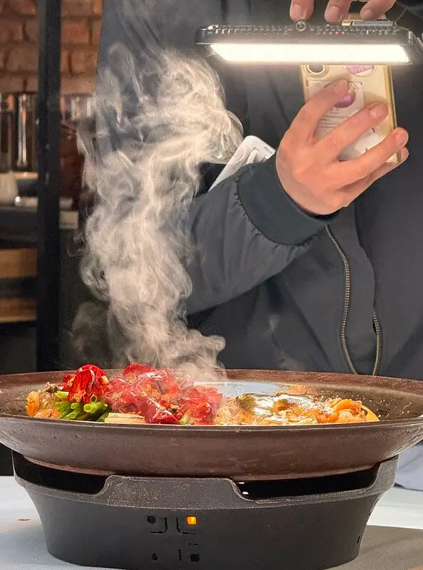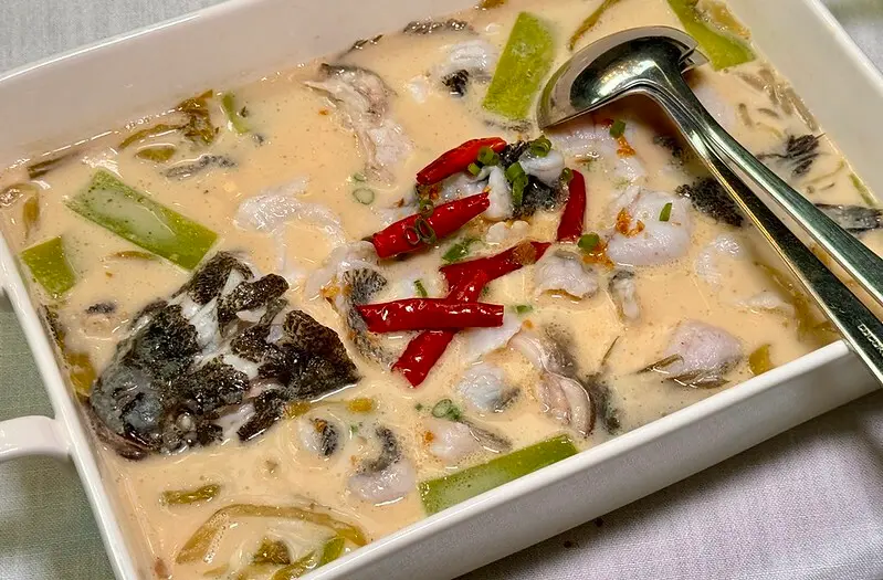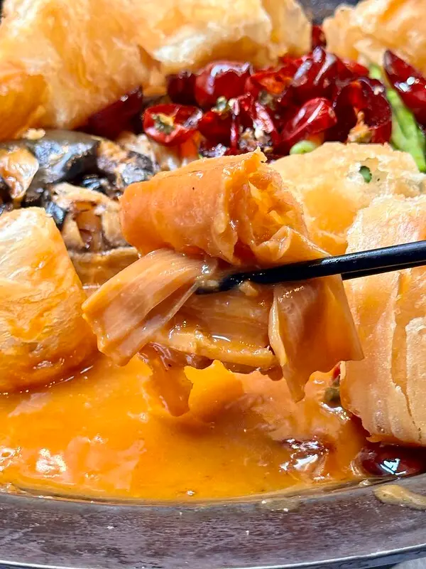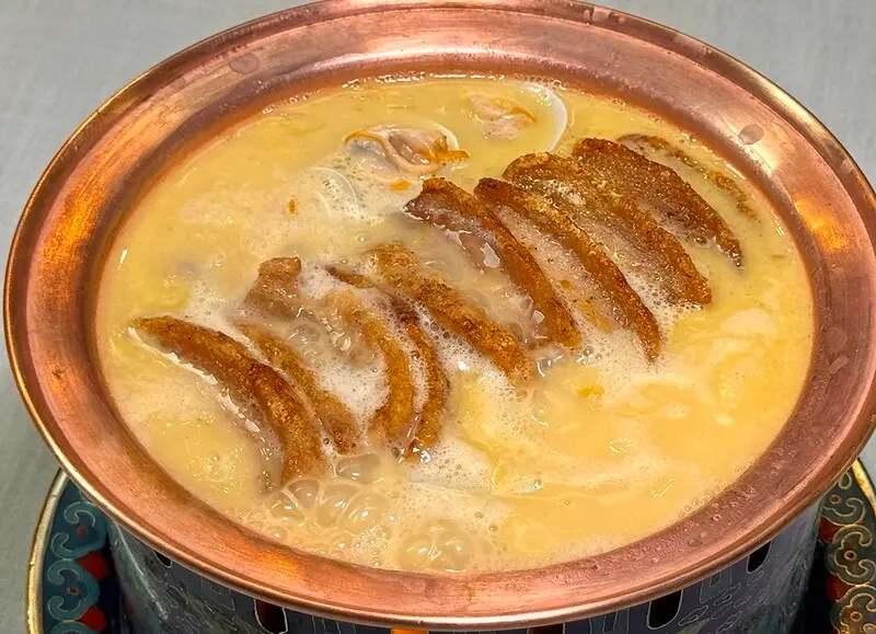 老北京菊花鍋脆皮燒肉,北京菊花鍋,或稱菊花暖鍋,一般是魚湯熬煮後,把魚骨取出,再加入溫水燙煮過的菊花、芝麻酱、甜醬麵、花椒油等北京料理少見的佐料,有些甚至會加韭菜花、豆腐乳,算是一道作功繁序的魚湯。拾久這一或,喝來特別的濃郁,卻又不鹹不膩,搭上炸過的脆皮燒肉的油香,可謂香上加香、濃上更濃,就算再飽還是硬連喝了三四碗,另外脆皮燒肉泡湯後口感也變得更軟糯,吸收了湯汁後也更有滋有味,上面脆皮的口感也添了滋潤變得更有層有次,要不是有人阻止,我會把上面的脆皮燒肉通通吃光XD
