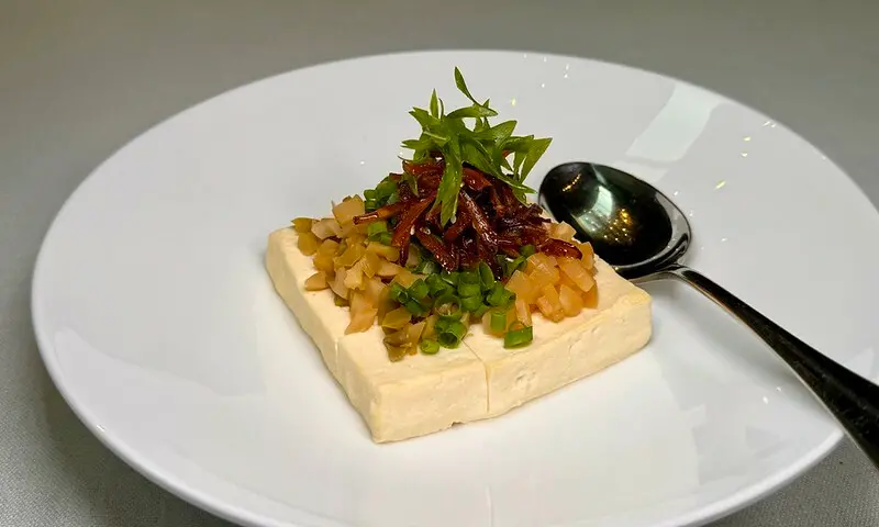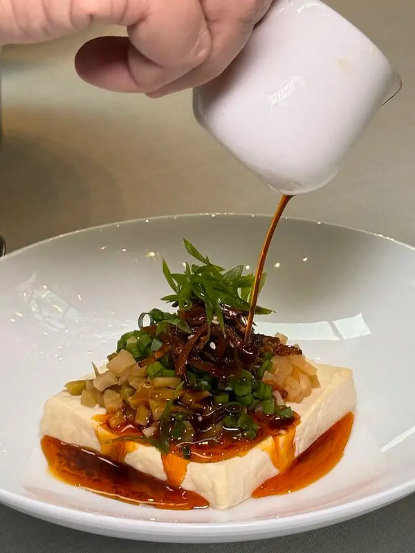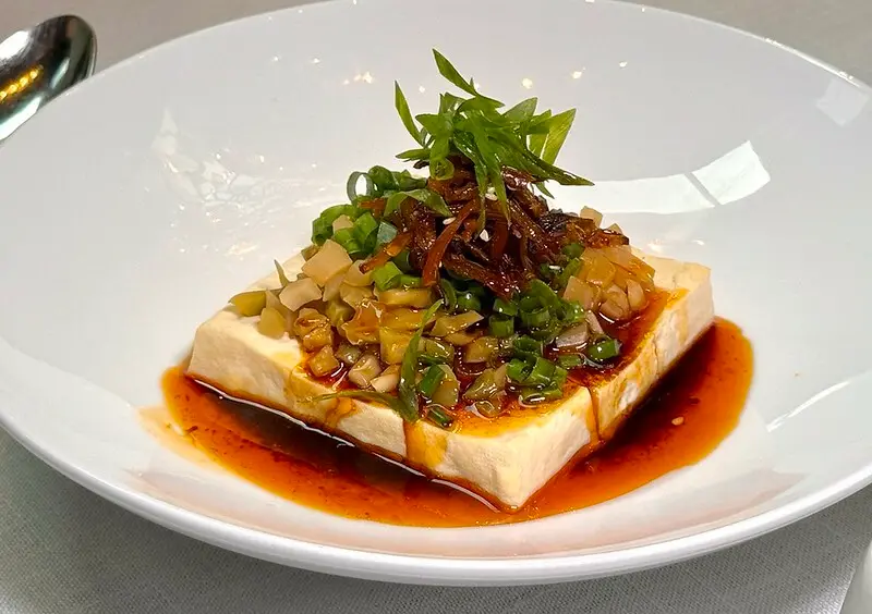 糖蒜拌豆腐,這道我不清楚是北京或是那的料理,又或是融合了各派系的豆廚作法,看起來有一點像川菜、又有一點湘菜的影子和北京的糖蒜串場。口味上因為淋上大量的紅油,吃起來的確偏川菜,但香而不過辣的辣油香真的非常討喜,當中的糖蒜在咀嚼端發酵時口感、味覺都大大加分,另外當中還加了溫蔥菇絲,既添了視覺,也加強整道料理的層與次。