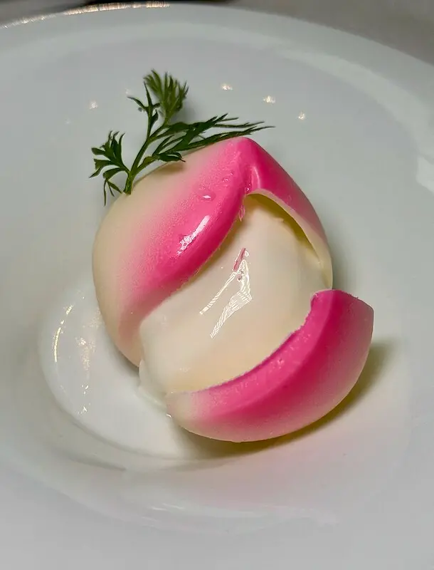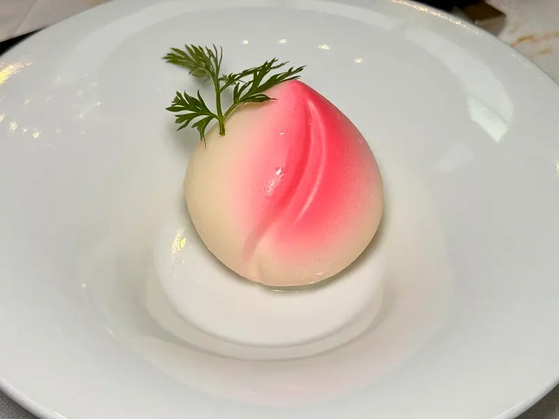 白巧克力壽桃杏仁豆腐,最後的甜點很特別,是用白巧克力作成的壽桃,咬開後裡面居然是中式甜品杏仁豆腐,有趣巧喜又美味。