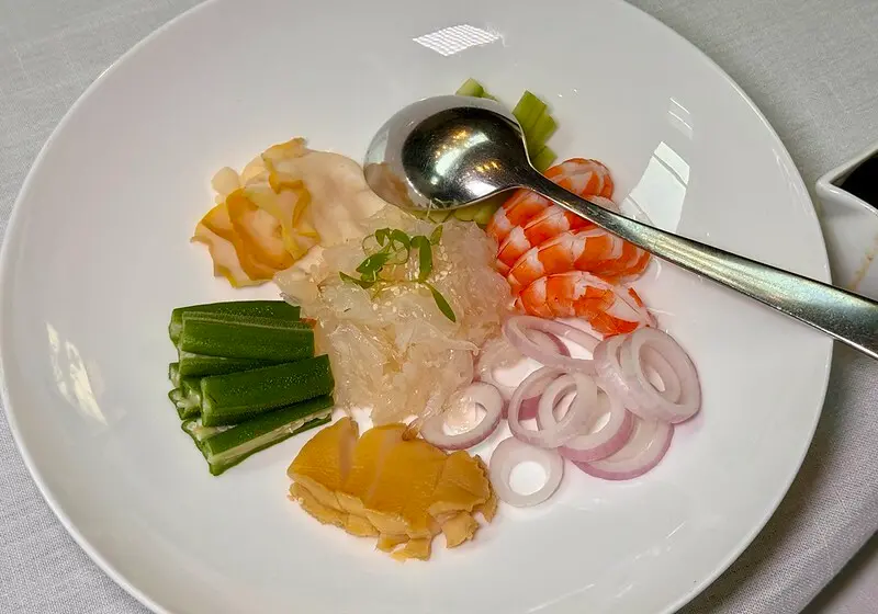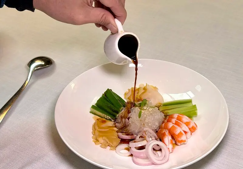 前菜第四碟:撈汁海鮮。鮑魚撈汁混合五種新鮮海鮮薄片,盤上分別放了海蜇皮、蝦子、貝類切片、醺魚凍(有一點像我們的沙魚煙),再搭配洋蔥、芹菜、黃瓜,淋上的是鮑魚撈汁,比較有趣的是這鮑魚撈汁像是加了一點老抽醬油似的,味道濃郁卻不搶,甚至是搶了海鮮的味,猜想和味覺末端微微的甜酸有關。