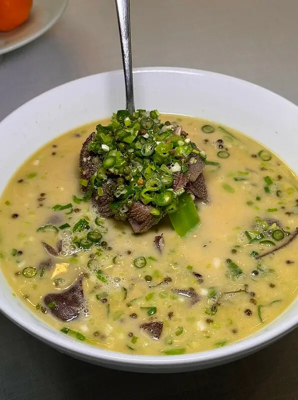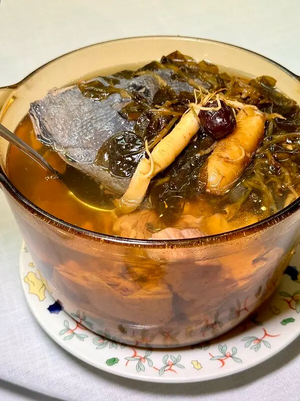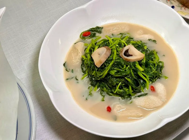 這道好像是覓菜竹笙,覓菜保有微微的爽脆,湯汁甜美帶一點點菇鮮和枸杞等中藥的甜,竹笙則吸滿了湯汁