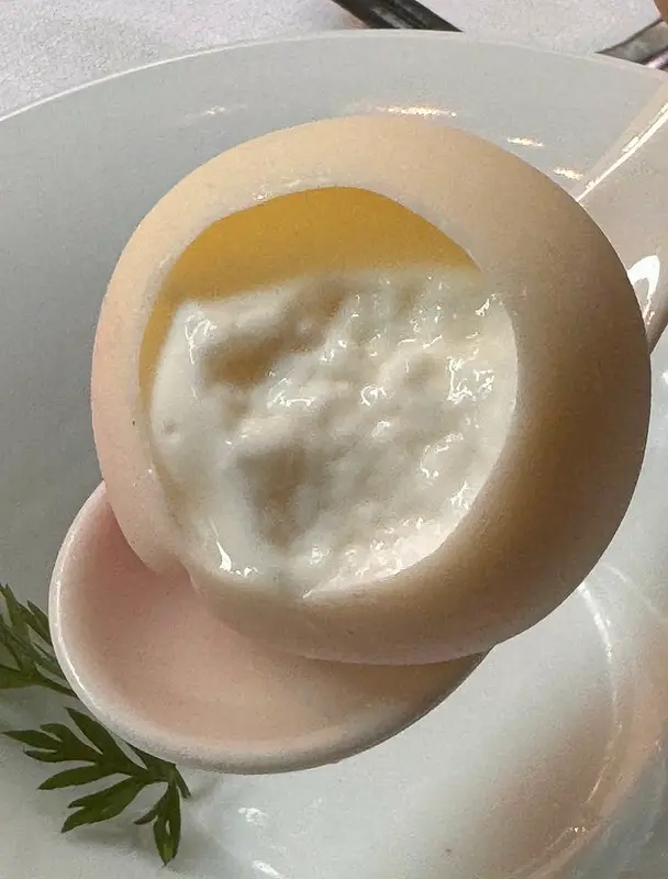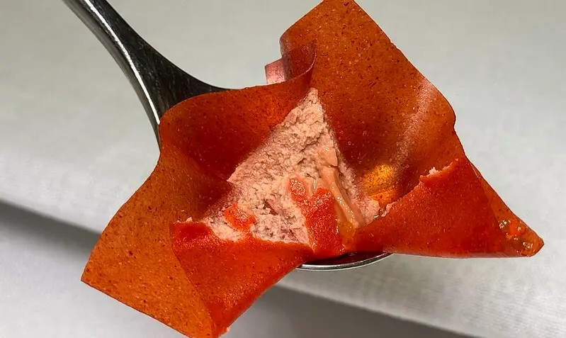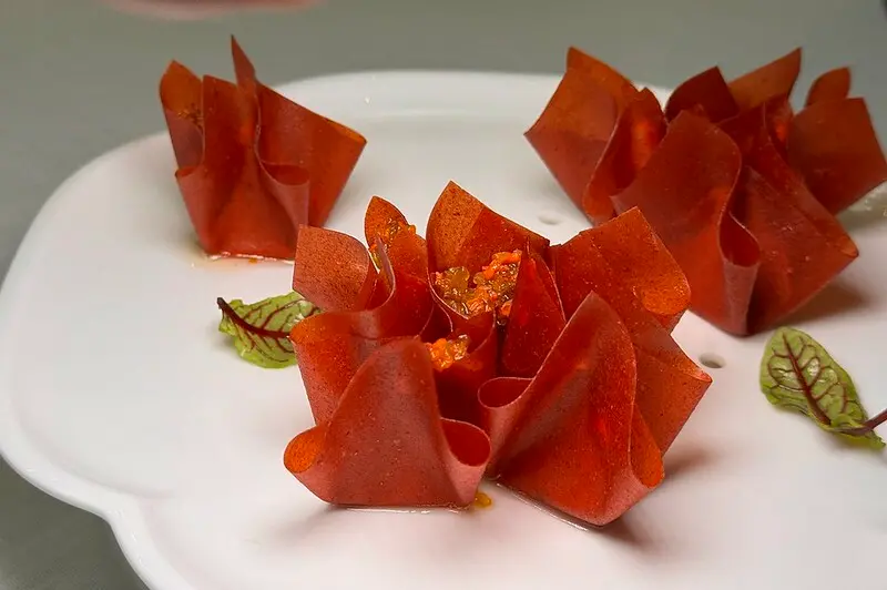開場的四道前菜就很精彩。第一道是,靈感來自中國的餛飩,以山楂製成的薄片代替餛飩皮,內餡則以鵝肝取代傳統的肉餡,視覺效果很有,也增加了這道料理的尊貴,作為迎賓的第一道,面子、裡子都有了。據說是清朝洋化洋食的作法,有一點中西合併的影子,自然也和老佛爺扯上一點關系。不管故事底蘊如何,這道山楂鵝肝還真是好吃,鵝肝的濃郁有了山渣的點味變得更有層有次,山渣薄片的微脆口,也為鵝肝的綿化舖成了前面有序的對比口感。