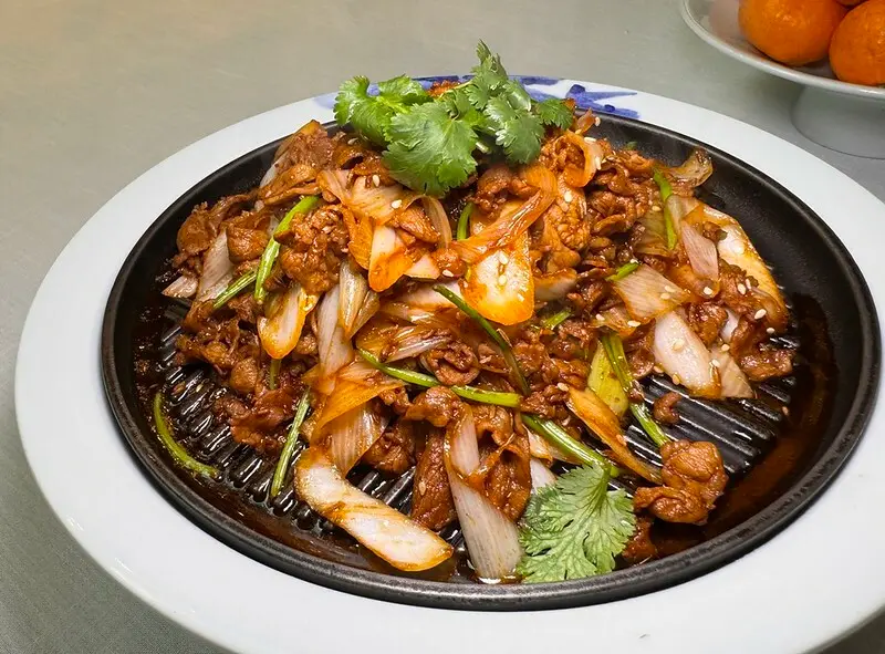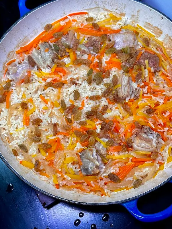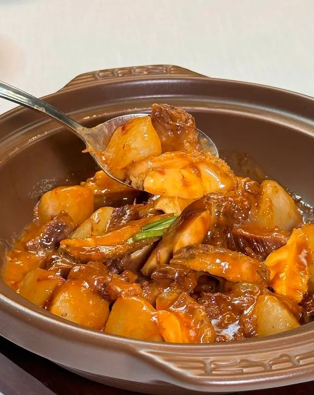 灘羊肉胡蘿蔔絲燜飯。這道有一點像新疆蒙古的羊肉抓飯,灘羊肉指的便是一種蒙古裘皮用綿,煮飯的同時加入紅蘿蔔、洋蔥,當然帶皮有點油脂的羊肉是重點,飯用的是比較細小的長米,口感像泰國米,燉煮的過程中比較會吸收紅蘿蔔的湯汁、洋蔥的甜、且羊肉的鮮,久煮後又不至於過於軟嫩,還能嚐到粒粒分明的咀嚼口感,上面的帶皮、帶油羊肉軟嫩微帶幾口的肉汁,在嘴裡和米飯反饋的香氣再次合而為一,算是一種新派的羊肉抓飯,相對清爽許多。