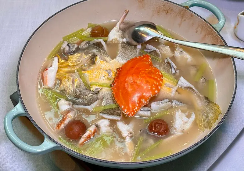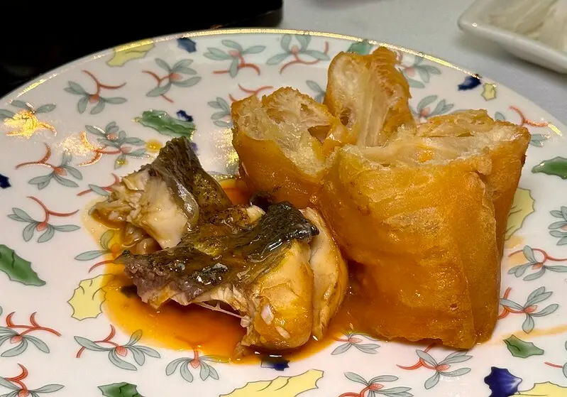 接下來幾道都是「國際寶豐旅行社」和餐廳老闆幫我們加的菜,所以如果名字記錯寫錯,還請見諒。這道料理用了黃魚、螃蟹煮湯,鮮上加鮮之餘巧妙用了梅干調「戲」,湯鮮之餘多了一抹酸香甜糯,就服務生的說法是把三道廣東料理結合為一的鮮蟹雙鮮湯,個人特別愛裡面吸收了蟹鮮的黃魚肉,鮮美無比。