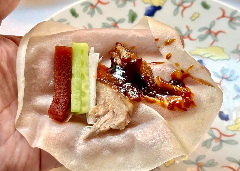 第二吃是應該是大伙都熟的吃法,比較特別的是山楂(感覺北京什麼都要用山渣),吃起來仍是甜麵醬為主,山渣扮演的是若穩若現的微解膩酸甜,大致上還是可以想像的口感和味道。
