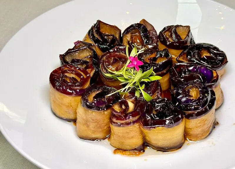 老醋茄子。身為茄子控(小時候不敢吃茄子,現在超愛),必需為這道料理拍手叫好,切得相對厚的茄子先蒸透後快速過油,使其保有油亮的視覺,淋上的是畫龍點睛燒到出香出色的老陳醋,沒想到茄子和醋酸竟可如此的合拍,雖說有一點難免的油。另外可能是茄子厚切又捲成圓形,一口入嘴即有茄子含水的飽嘴,又有像是肉片咀嚼層次,也讓調味的老陳醋可以徹底的融入茄子。妙。
