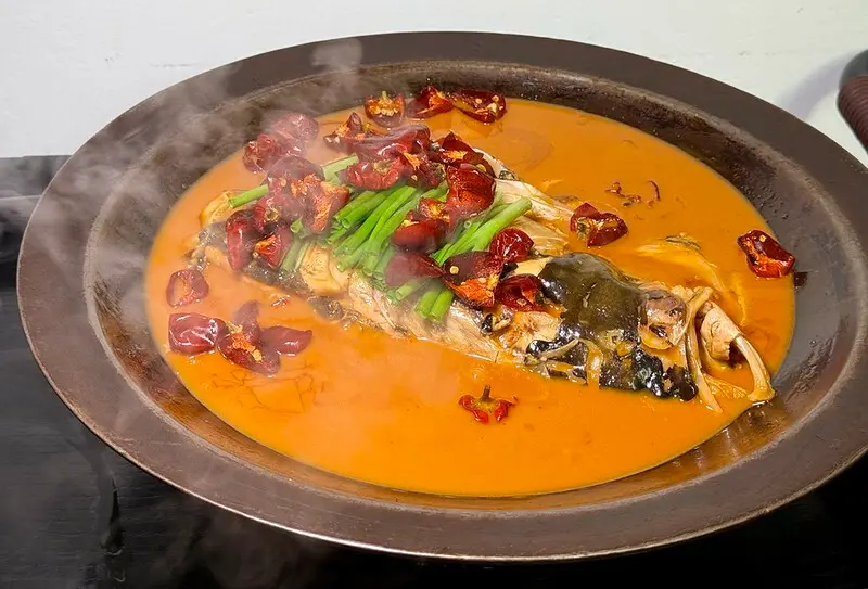 拾玖絕味魚頭-鰱魚頭先蒸後燒搭配巨大油條,這道據說是創辦人「段譽」的拿手好菜之一,好吧,也是個人目前為止吃過最棒的魚頭料理,那燒出帶點微稠的醬汁,香純帶著討喜的甜韻,半點也沒有鹹膩的問題,搭配現炸酥嫩的大油條,我一連吃了五六塊還欲罷不能...真是好吃得亂八九糟,至於魚肉...老實說我半點也不在意XD,順便說一下上面的紅辣椒只是增色沒有辣度,鍋底附滿湯汁的筍子千萬別吃漏。