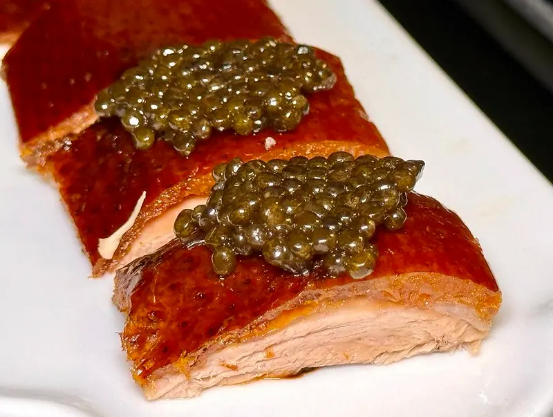 掛爐烤鴨三吃:鴨肉配魚子醬薄片、鴨肉沾醬配山楂蔥段卷餅、酥炸椒鹽鴨架。這烤鴨澎皮澎皮,油亮的賞心悅目,片開的鴨肉還呈現粉嫩的成色,看了叫人口水直流。