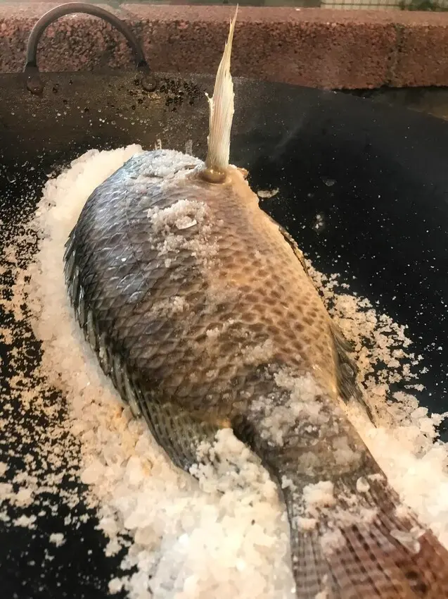 吃著一直有一股花椒的香氣,原本以為老闆是在鹽中加花椒調味料,後來發現不是,花椒是完整的顆粒跟蒜粒、薑片一起塞進魚肚裡,在經過鹽焗燒烤,讓花椒、蒜的香氣滲入魚肉之中,賦予活魚多層次的魚鮮味,超好吃啦!愛吃魚的朋友一定可以吃得超過癮的!