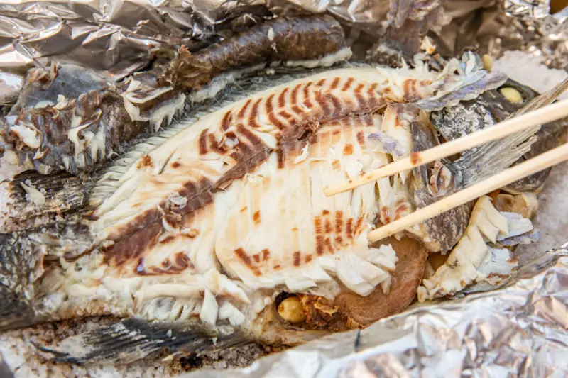 表面烤到有點焦黑,魚皮是帶鱗片一起烤不能吃,把魚皮翻開吃肉就好,魚肉看起來白嫩白嫩的,還飄散出一股燒烤的清香,一口吃下細嫩的魚肉簡直驚為天人!因為使用的是新鮮的台灣鯛,吃起來完全沒有腥味及土味,鹽將魚的鮮味直接封住,完全保留住魚肉多汁及軟嫩細緻的口感。