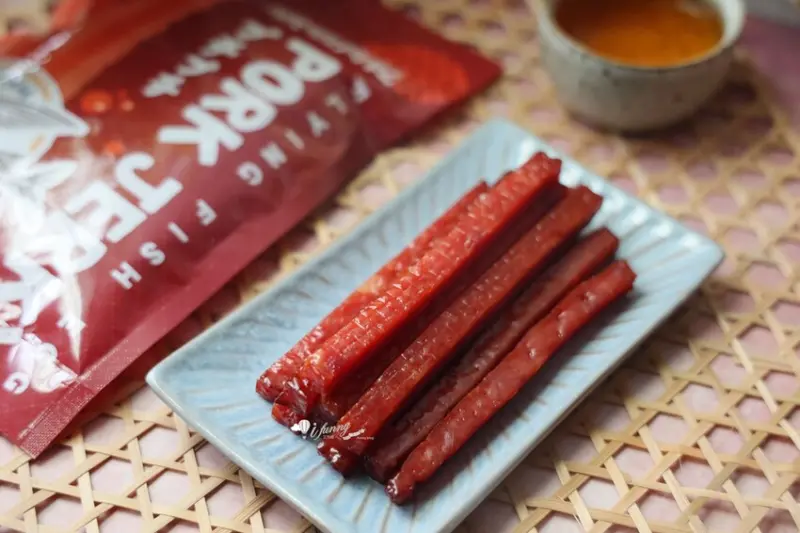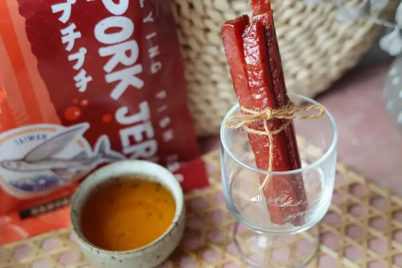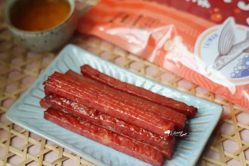 這個是阿里棒棒啵啵豬肉乾之前的圓扁形狀,第一次嚐到時,感覺飛魚卵在口中跳躍的美好滋味,真是太有記憶點,一吃就停不下來!