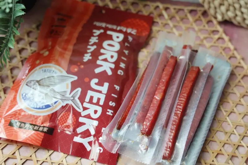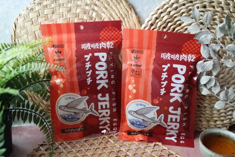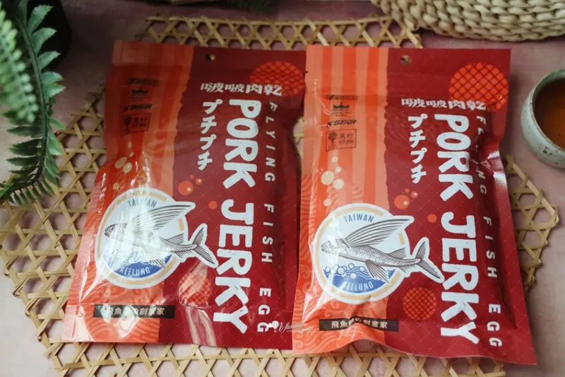 這次阿里棒棒啵啵豬肉乾全新包裝,採用喜氣的紅色,包裝上飛魚圖樣,正是飛魚卵加入肉乾的特色。