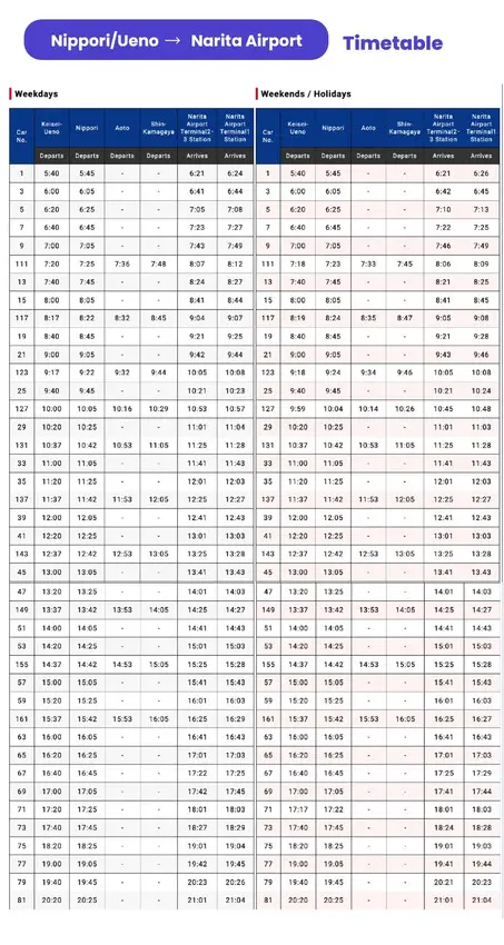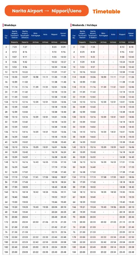 從成田機場發車的時間為每天07:23-23:00,每小時最多3個班次,每隔 20 分鐘就會出發一班,平日與假日的發車時間會有些許不同。