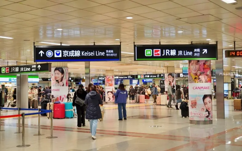 真的是一出海關就看到 京成電鐵 Skyliner 的廣告,看到海報後右轉就可以看到鐵道路口,搭乘手扶梯往下就是了,超方便。