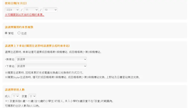 線上購買最快36分鐘連結成田機場及東京都心的Skyliner優惠票及組合套票。有提供繁中版本,然後購票程序非常簡單,輸入護照英文姓名、性別、國籍、出生年月日,以及email,訂購完成後會收到確認信件,信件中會有QR code。