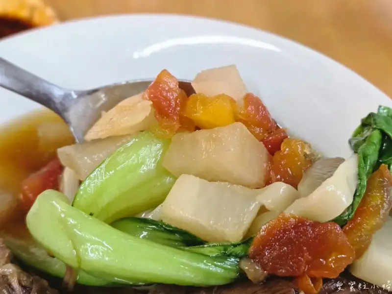 蕃茄和白蘿蔔熬的蔬果湯,再舀入原汁牛肉湯, 牛肉湯鮮甜清爽還很順口。