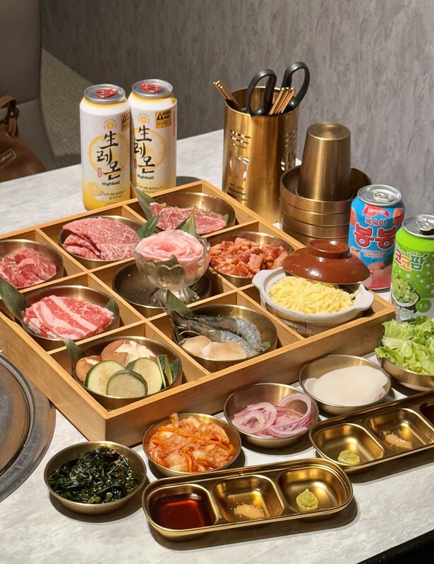 這裡主要的消費方式是2-4人的套餐,有純燒肉,也有燒肉加韓食的套餐,另外燒肉的肉品幾乎都可以單點,當然韓食也是。因為第一次來,乾脆直接請服務人員推薦,剛好也是隊友想吃的九宮格燒肉海鮮和起司安東燉雞。