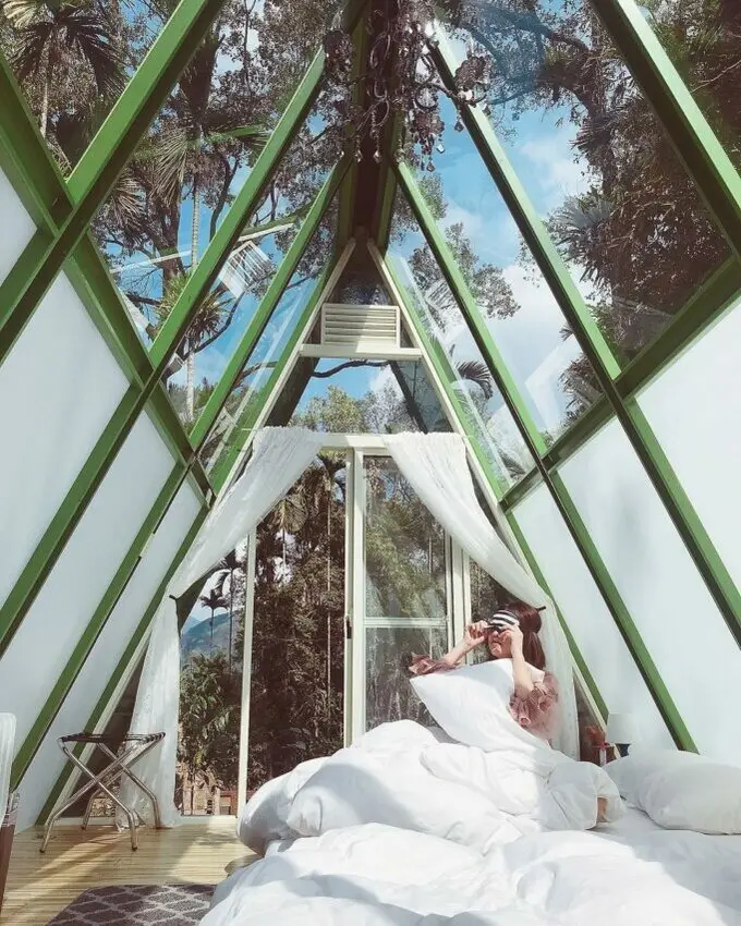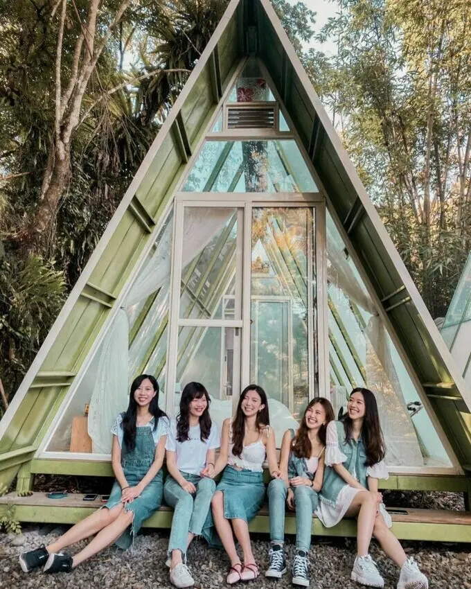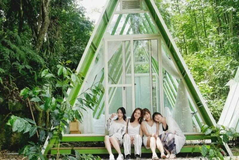 來吉部落的「Hamoana 星空帳篷」座落阿里山山脈最高峰塔山的山腳處,木棧板上綠色的三角玻璃屋,被周圍的植物與樹木包圍,就像是森林小精靈的家,是阿里山地區最熱門的IG打卡露營地!「Hamoana 星空帳篷」共有兩頂帳篷,一次總共只能接待八人體驗,並且不開放自己搭設營地,入住的費用包含了「不舞作坊」提供的早晚餐與體驗活動,體驗內容包含做麵包、烘咖啡豆、煮咖啡,讓入住的旅人可以好好享受,體驗部落族人的日常。