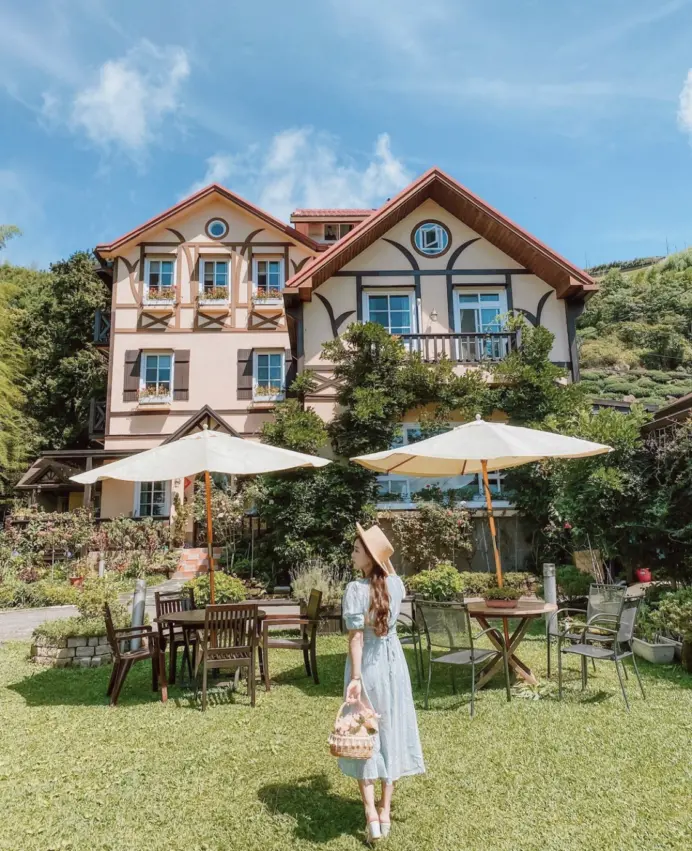 「四季星空」位於阿里山半山腰處的隙頂村,是眺望日出日落及欣賞壯闊雲海最著名的地方之一,也是阿里山的茶產區,終年山嵐飄渺、如夢似幻。平價卻擁有童話般風格的「四季星空」,仿造南歐風格的裝潢設計,米黃色的外牆與紅磚屋瓦搭配出美麗的歐洲庭園小屋,在藍天之下更顯可愛!
