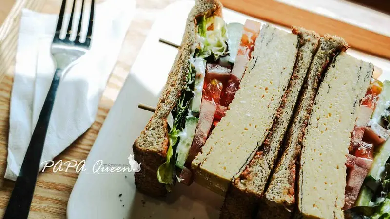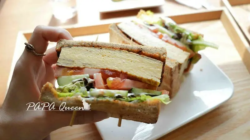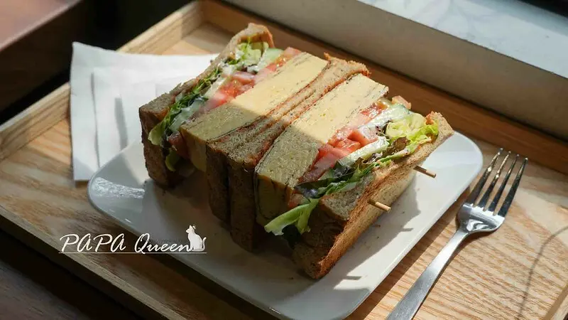 這個是主食加一杯飲料,或是飲料折抵$50。中間的厚蛋燒真的超厚的,我跟小米都超愛,吃起來很有層次感,有鹹香、蛋香,還有獨特的鍋氣,配上新鮮蔬菜的酸甜清爽,這個真的很可以點,份量也很扎實。那個厚度,老實說我自己在家是煎不出來啦。明太子不是那種很張揚的味道,是隱藏在三明治裡面,咬下去的瞬間會在嘴裡默默地彈跳,讓人會越吃越開胃喔。