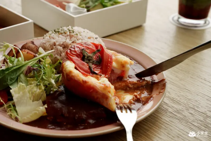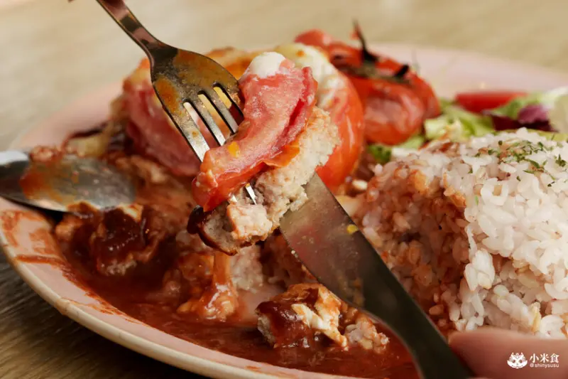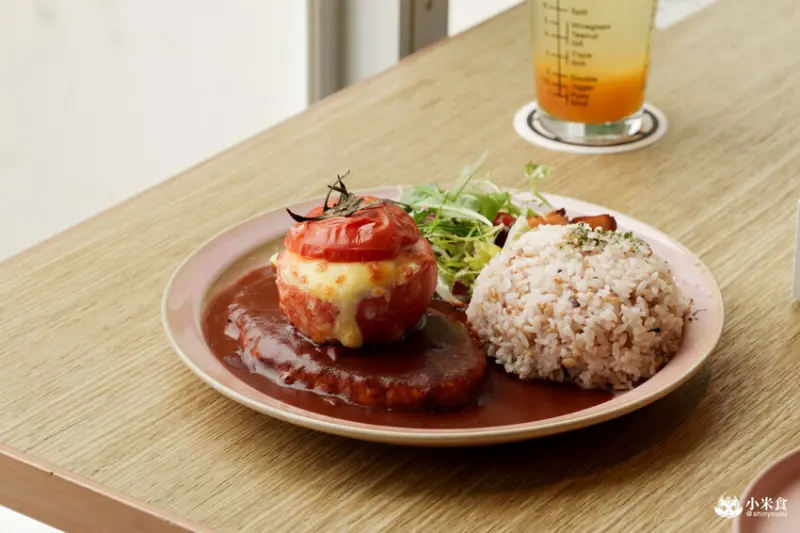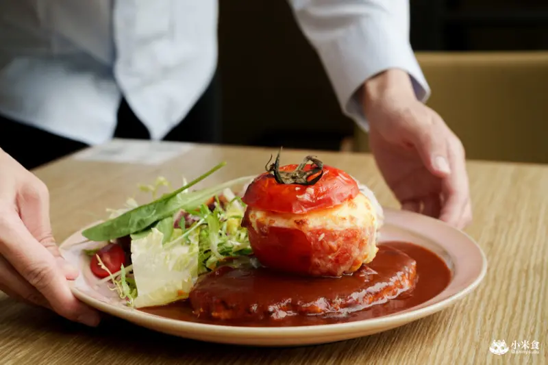這道漢堡排飯也深得米心,流淌著豐沛汁液的焗烤蕃茄裡,藏了顆濃香溫玉,酸甜茄香搭上漢堡排的嫩香彈Q與飽滿肉感,結合唰嘴迷人的紅酒醬汁,好吃說好吃