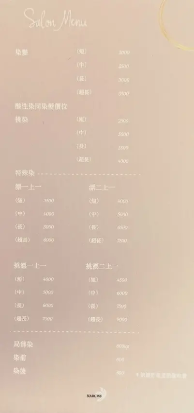 NarcissHair髮型價格表如下,壽星當月消費打七折,想變美、轉換心情,還是犒賞自己,來這裡,讓你阿嬤都會誇你變超美!