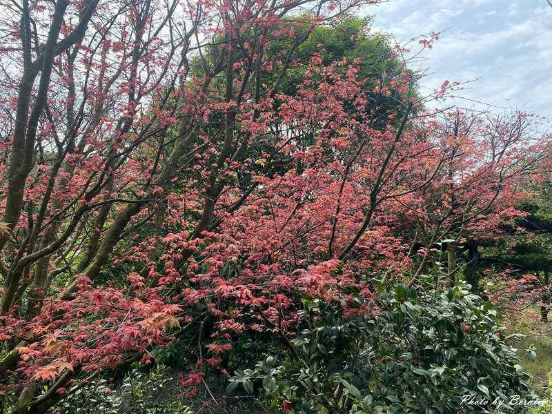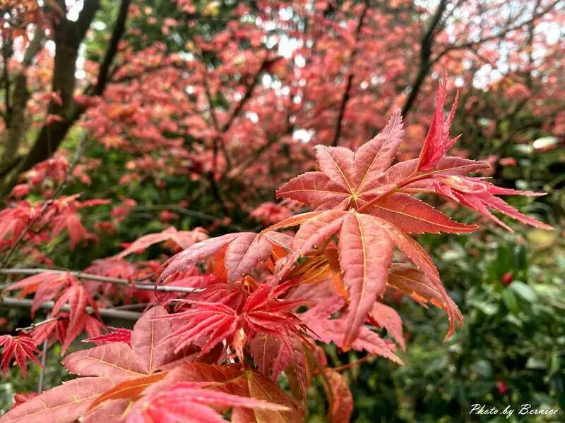 最棒的賞楓季是在4月~5月份,主要是因為楓樹皆嫁接日本品種,由於品種特性,其嫩芽期有一個多月的時間是紅色新芽,後因氣溫逐漸變熱與降雨影響,葉綠素變化,由紅漸綠,此外亦有多品種顏色各異;園中的楓葉分為大楓葉與小楓葉。大楓葉是看落葉,秋冬是最好的時節;而小楓葉則是看楓紅,每年的四、五月是楓紅之最