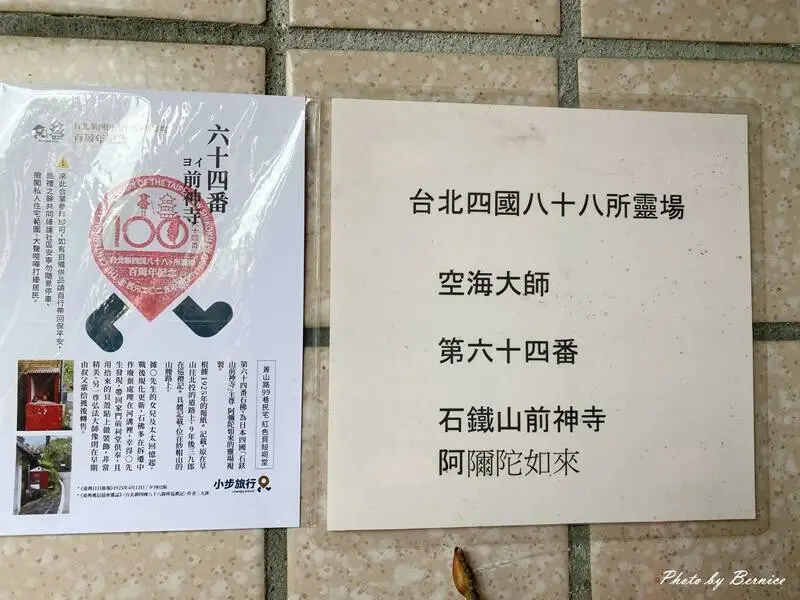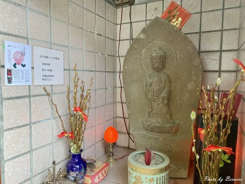 「台北新四國遍路」是日治時期1925年,由旅居臺灣的日本信徒發願設立,象徵著將弘法大師的修行精神與四國遍路文化引入臺灣,當年共設置88尊船型光背浮雕石佛,依據日本四國各寺本尊雕刻,安置於臺北西門町、圓山、芝山岩、草山、竹子湖、北投等各處安置放置石佛,用「石佛」代替「佛寺/靈場」串起的朝聖路線守護台灣,二次大戰結束後,日人引揚歸國,台北石佛也因無人供奉與管理,大都不在原處而流離失所;六十四番目前是一戶民宅在供奉,所以來參拜時要有禮貌哦