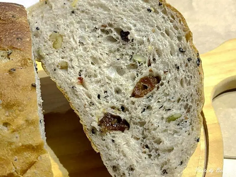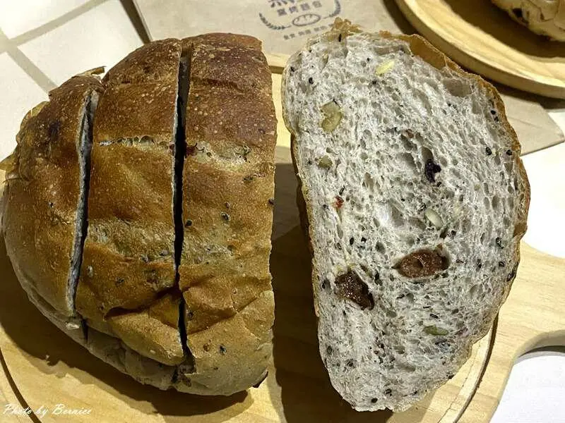 堅果麵包內包含葡萄乾、蔓越莓、核桃、腰果、南瓜子和黑芝麻,堅果與果乾的黃金搭配,喜歡豐富口感的人,選綜合堅果準沒錯;不知是否剛出爐的關係,麵包體相當鬆軟,入口可以感受到各種香氣,果香、麥香與堅果香一次擁有