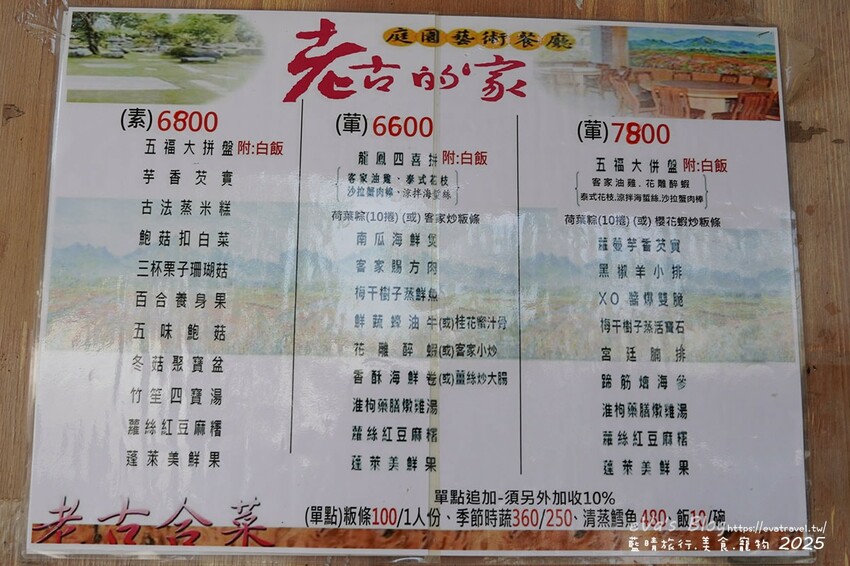 老古的家過年只供應客家料理合菜,有$6600元、$7800元;也提供素食合菜$6800元,都是10人份合菜,那再訂位時有先跟店家詢問,因為我家人數比較少,可不可以從合菜菜單裡挑選幾樣料理,店家說可以的,所以我們就來吃啦!