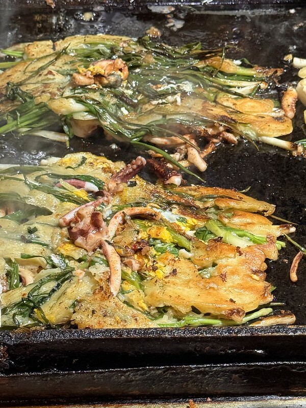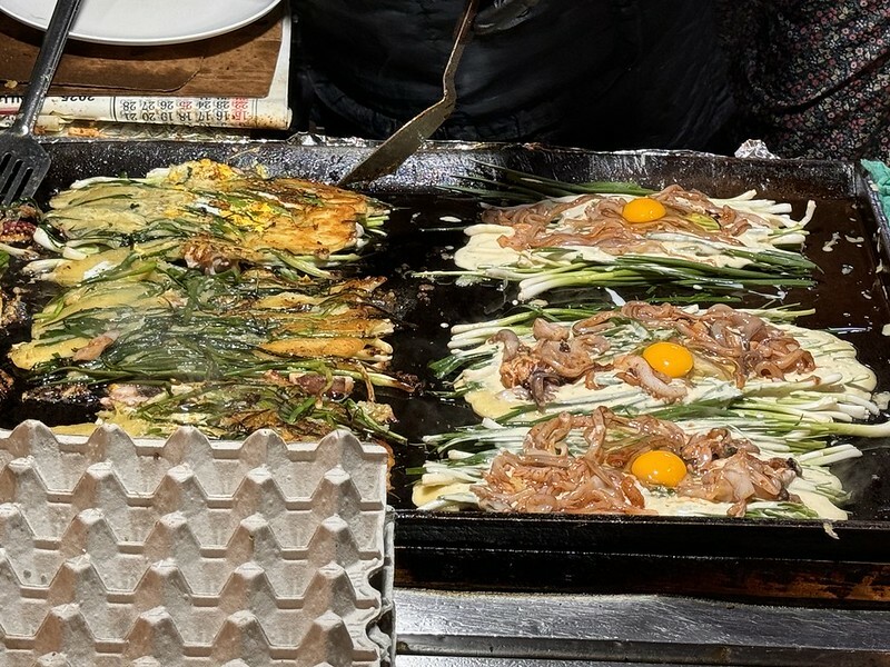排隊時看了一下這海鮮煎餅是8000韓幣一份,說真的跟接下來我們感受到的釜山親民消費,算是有一點點偏貴,但還是那句話偶爾吃一次,也許也是一輩子唯一一次,想吃就吃。另外發現,其實這也有店裡的內用,不過因為我們只想吃一份海鮮煎餅,於是選擇了外帶。