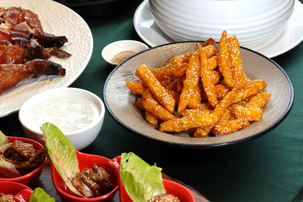 超經典的桌菜甜點!一上桌熱騰騰,外面有亮晶晶的糖絲,夾起來還可以拉糖絲~地瓜裡面綿密甜香,外皮有點脆糖感,吃的時候沾一下冰水讓糖衣變脆,完全就是小時候辦桌的幸福味道!