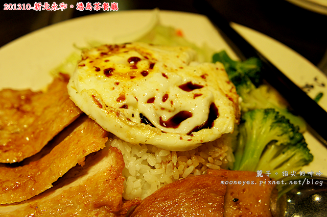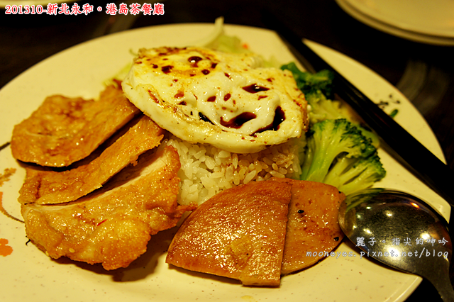 一端上桌就很有廟街的感覺XD,蓋上豬扒跟荷包蛋、醬油,