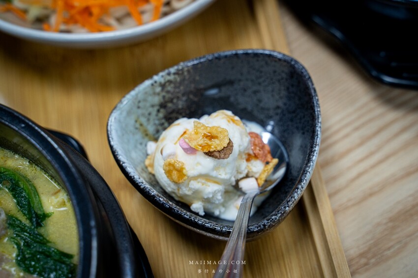 除了主打的咖哩砂鍋煲,94咖哩孃的附餐也同樣令人驚艷。招牌「醋溜麵」採用日本拉麵麵體,淋上酸香開胃的特製醬汁,酸度與鹹度比例恰到好處,能在品嚐完咖哩後達到味覺平衡,若敢吃辣,建議搭配店家自製的辣椒醬,可讓風味層次更上一層樓。此外,店內提供自助區可自取餐具,並有老闆手炒辣椒,非常搭配他們家的食材。餐後甜點則有口感滑嫩、解膩的「愛玉」,以及令人愉悅的「香草冰淇淋」,冰淇淋上還點綴著棉花糖和玉米脆片,奶香中夾帶玉米脆片的甜香,為用餐體驗劃下完美句點。單點醋溜麵也可搭配湯品,例如品質不錯且湯頭甘甜的貢丸湯。