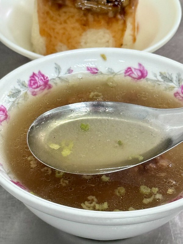 米糕30元。大台北賣米糕不在少數,但這種白糯米糕算是比較少見,通常是偏向油飯的那種金黃居多,吃將上來口感有一點像小時基隆賣的甜米糕,口感比油飯更軟糯也帶著更多的黏口感,淋上的醬汁有醬油和辣椒醬,鹹辣多一點討喜的嘴邊微甜,更重要的是上面的蒜泥,有著龍點睛的存在,上面的肉也是大台北比較少見的肉條,咀嚼端多了一點口感和米糕間的互別苗頭感也多了一些,算是相當有層次的米糕,對我來說是喜歡的。