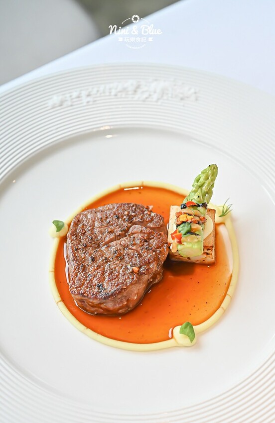 一旁搭配層層堆疊起來的洋芋千層,以及多汁蘆筍,底部則是紅酒醬汁、洋芋泥,盤緣還有鹽之花讓你隨心意調味。