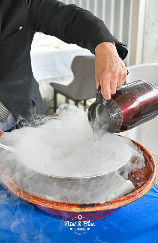 最後甜點是桌邊現場表演的炒冰,以季節水果慕斯為基底,倒入液態氮瞬間降溫拌炒
