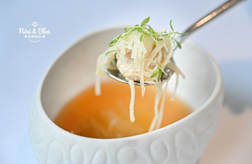 會在桌邊倒入金黃色清雞湯,裡面有著一顆雞肉慕絲球,搭配筍絲與鮑魚絲增添脆口感,很喜歡這清爽卻又濃厚的清湯,鮮香好喝~