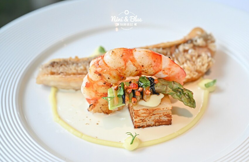 一旁還有鮮甜彈牙的海大蝦,搭配洋芋千層、蘆筍,底部的醬汁則是檸檬奶油醬汁,搭配海鮮很清爽~