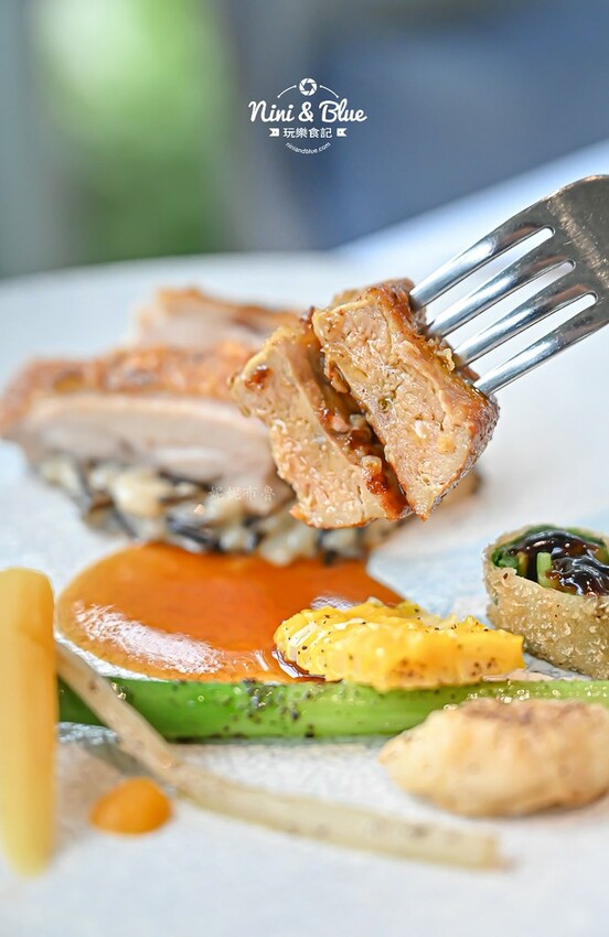 以法國薩索雞為主角,搭配帶點黑色外皮的加拿大野生米,一旁鮮蔬有青花筍、水果玉米、迷你胡蘿蔔、百合心、酥炸菱角,經過炭烤激發蔬果原本甜味,還有捲狀的龍鬚菜佐黑蒜醬。(鮮蔬的品項會依季節調整)