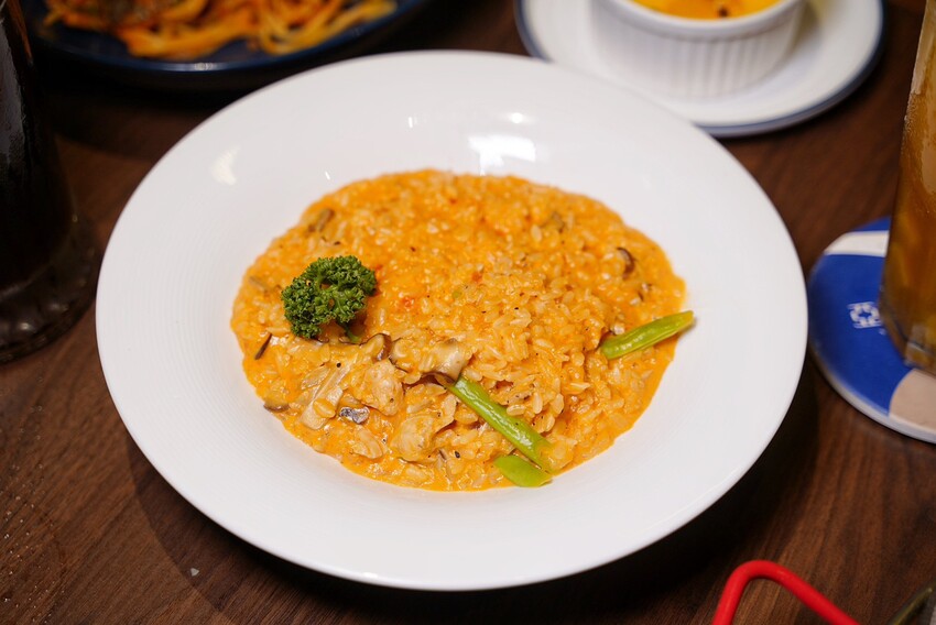 「橘醬嫩雞燉飯」紅醬的微酸與白醬的奶香交織在一起,入口還帶點蒜香提味,整體味道更豐富多層次,雞肉跟香菇的量也很有誠意,燉飯熟度也剛剛好,不會爛爛的,沒想到燉飯也蠻有水準的,不想吃麵的朋友,燉飯可以試試。