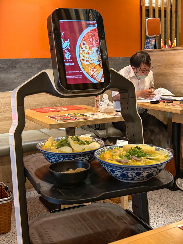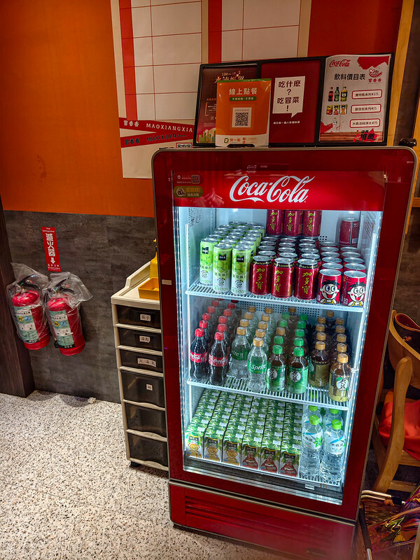 冒香香逢甲店就在台中知名的逢甲夜市旁邊,走路大約六到八分鐘就有停車場,交通上非常方便。店裡面的用餐環境也很舒適,空調很涼爽,在這樣的天氣吃熱辣的冒菜,涼爽的環境真的很加分。桌子之間的距離很夠,中央走道也特別寬敞,這是因為他們有使用送餐機器人,避免員工端重物造成危險,非常注重安全。店裡有兩人座和四人座,座位安排很彈性,還貼心準備了置物籃讓客人放包包,店內也有販賣各種飲料,對於喜歡挑戰辣度的客人來說,飲料可說是不可或缺的搭配呢。